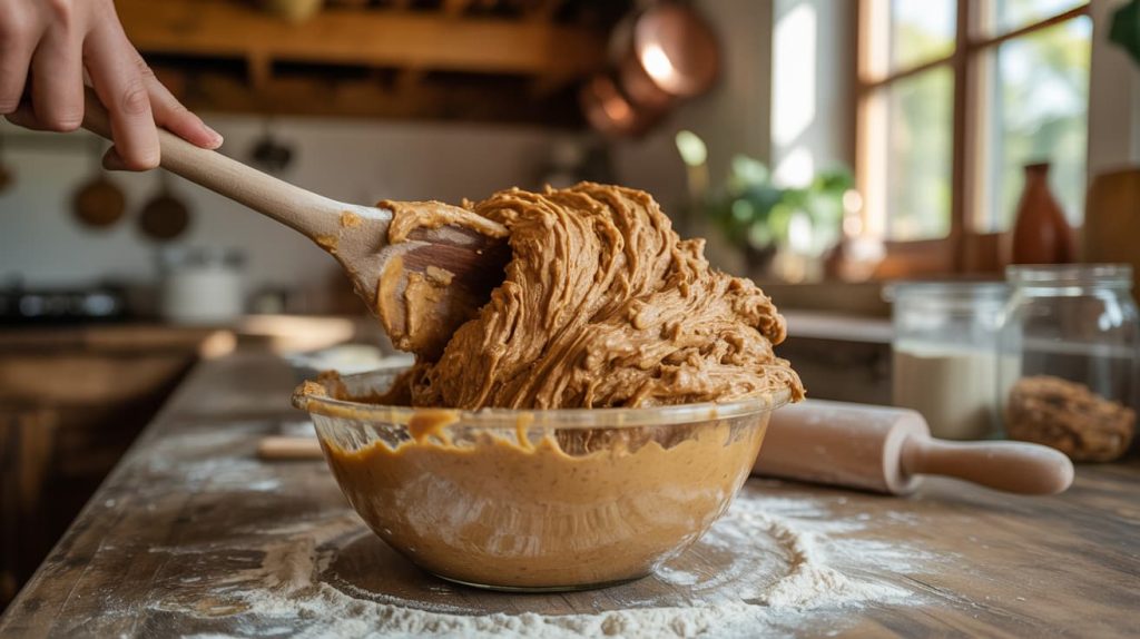 Add peanut butter, egg, and water to the dry mixture. Stir until a thick dough forms. The dough should be firm but pliable.
