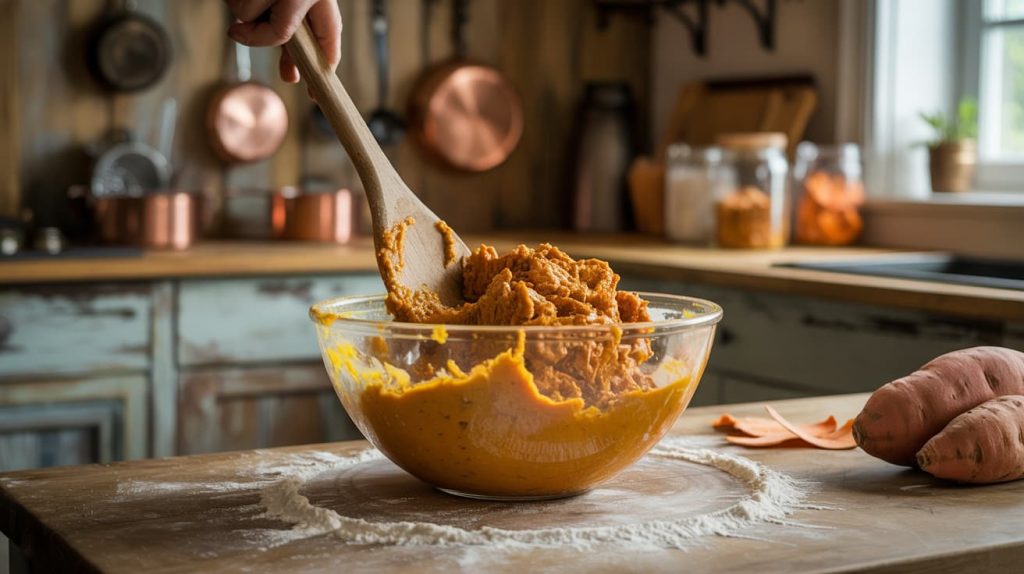 Peel and chop one medium sweet potato. Boil or steam until fork-tender, then mash until smooth. Let it cool completely before using.